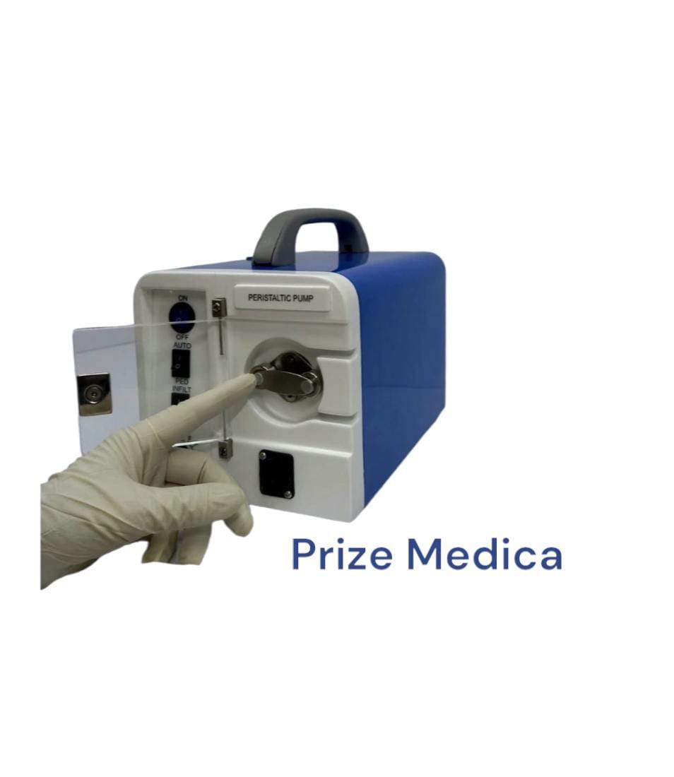 Fabricada en plástico reforzado y sus partes metálicas son en acero inoxidable, al ser compacta ( sin cierres móviles y ajustes para mangueras) es silenciosa y no presenta desajustes a través del tiempo. Marca Prize Medica. Está tiene una capacidad de infiltración de 0 a 800 cc por minuto y su mando, en el botón ON-OFF ( prendido-apagado), con velocidad variable.Voltaje: 110 - Consumo: 2.5 Amp Motor Tipo DC. Sus accesorios son: Pedal, Atril, 3 Metros de manguera siliconada grado medico para infiltrar y Un conector para suero en acero quirúrgico.